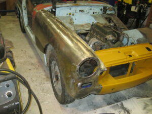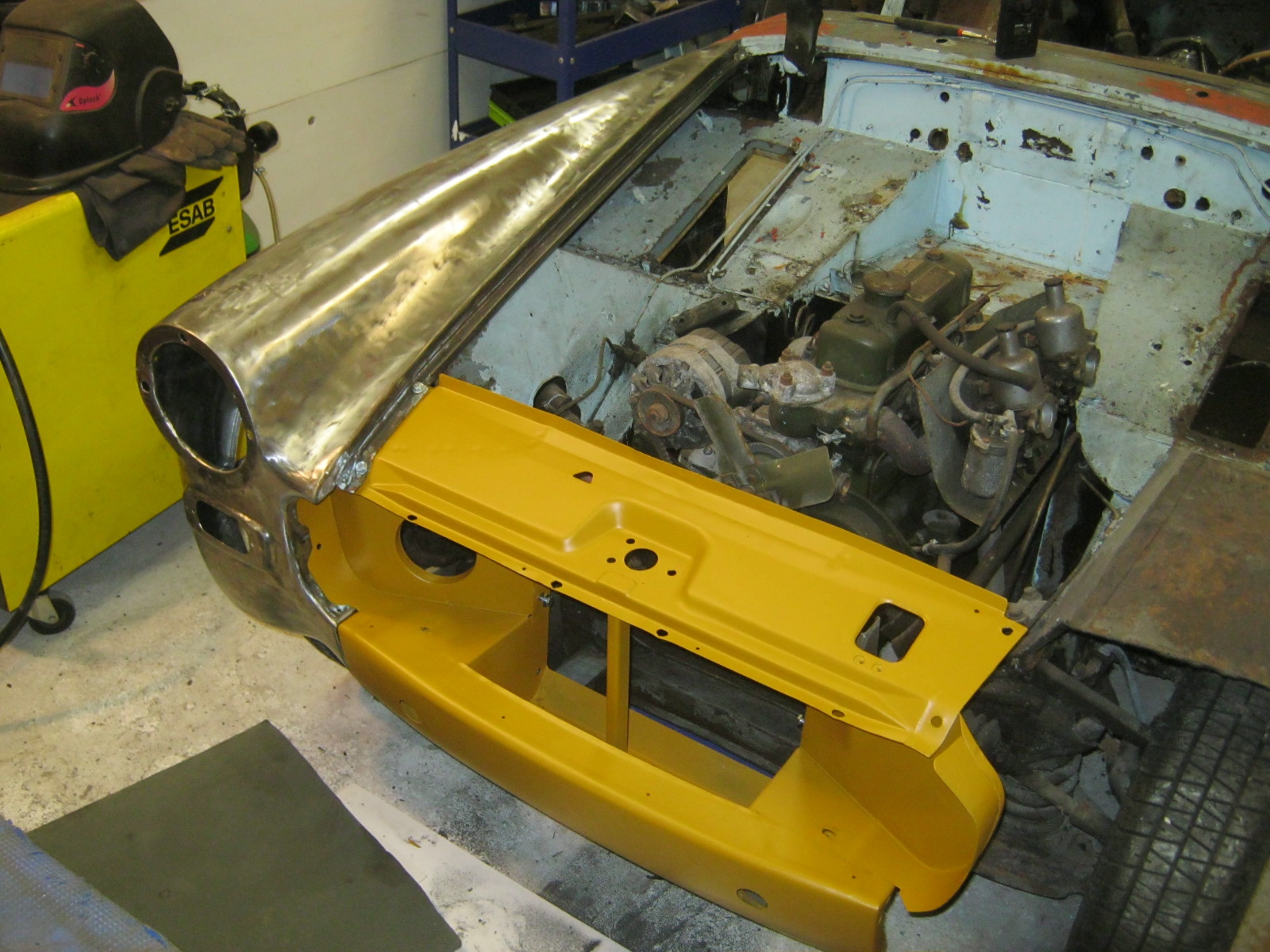 Provmontering framskärm Efter riktning av bucklor och lagning av rost i framskärmen blev det idag dags för en provmontering av framskärmen. Ser ut att fortfarande passa, så då kan den grundmålas snart.